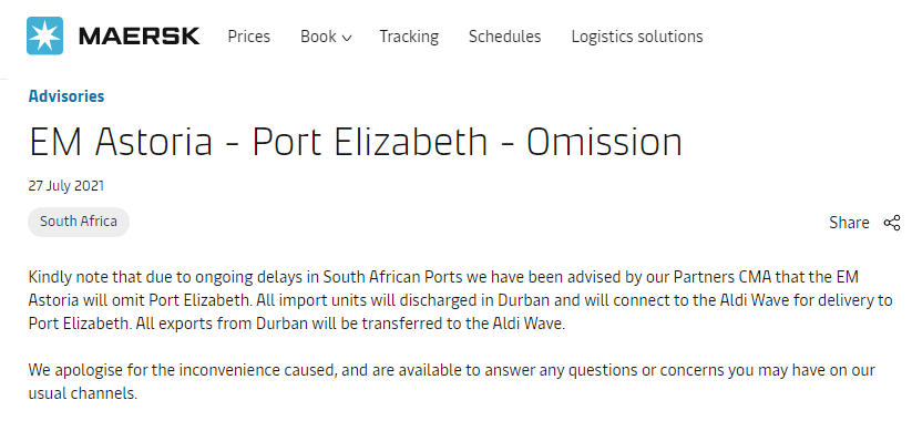 原定停靠南非港口的船只现在正驶向邻国,或者完全跳过它们在非洲港口的挂靠。船只已经开始绕过南非港口,现在可能会有更多的船只跳港。