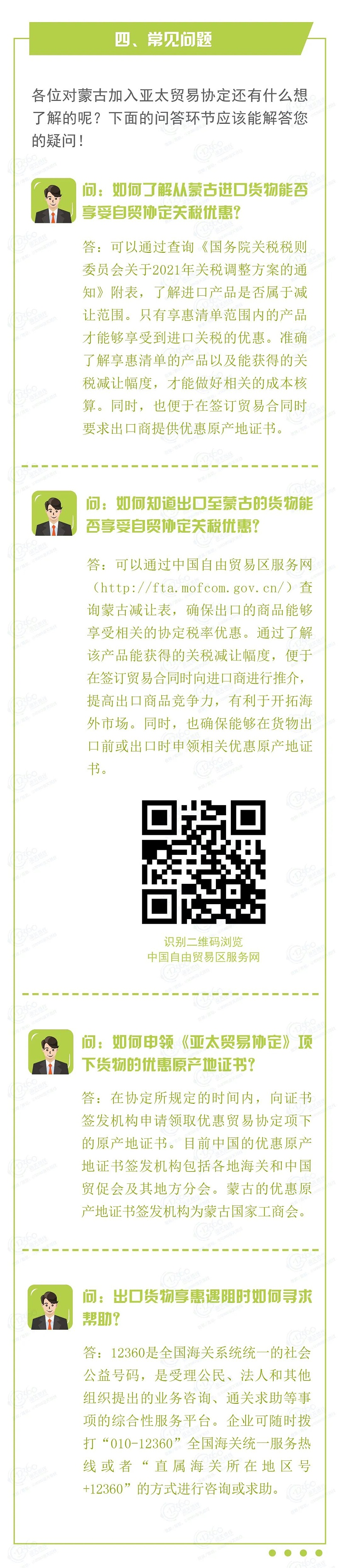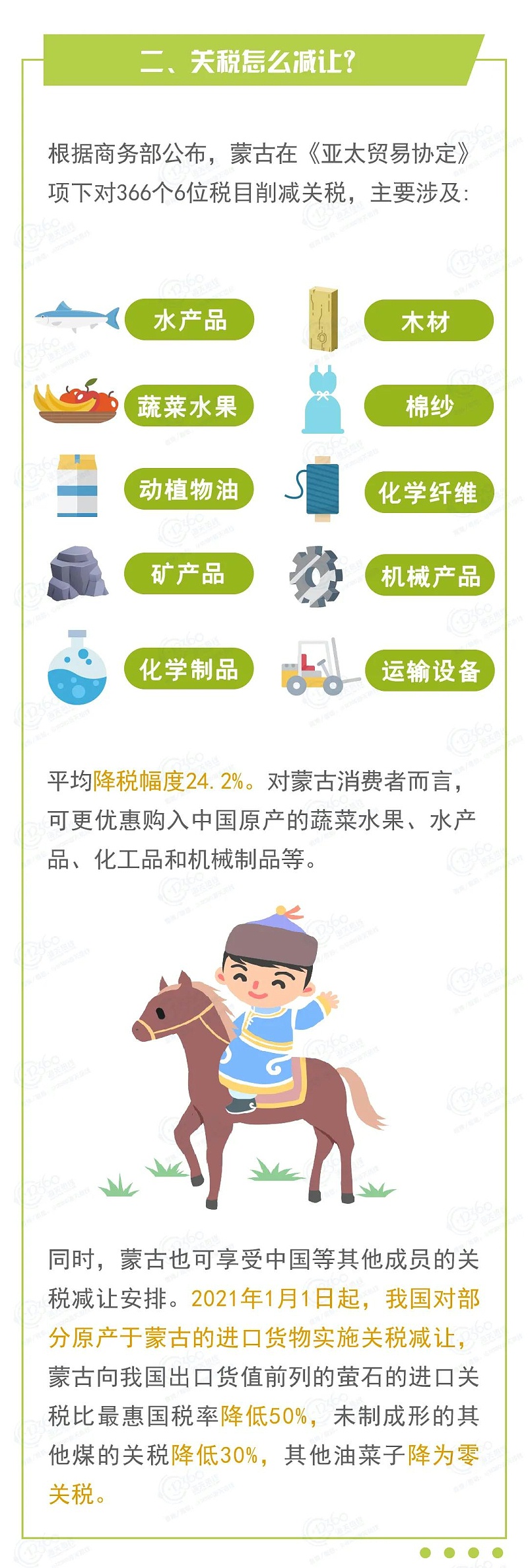 同时,我国在《亚太贸易协定》项下的关税减让安排适用于蒙古国。具体关税减让安排可查询中国自由贸易区服务网。