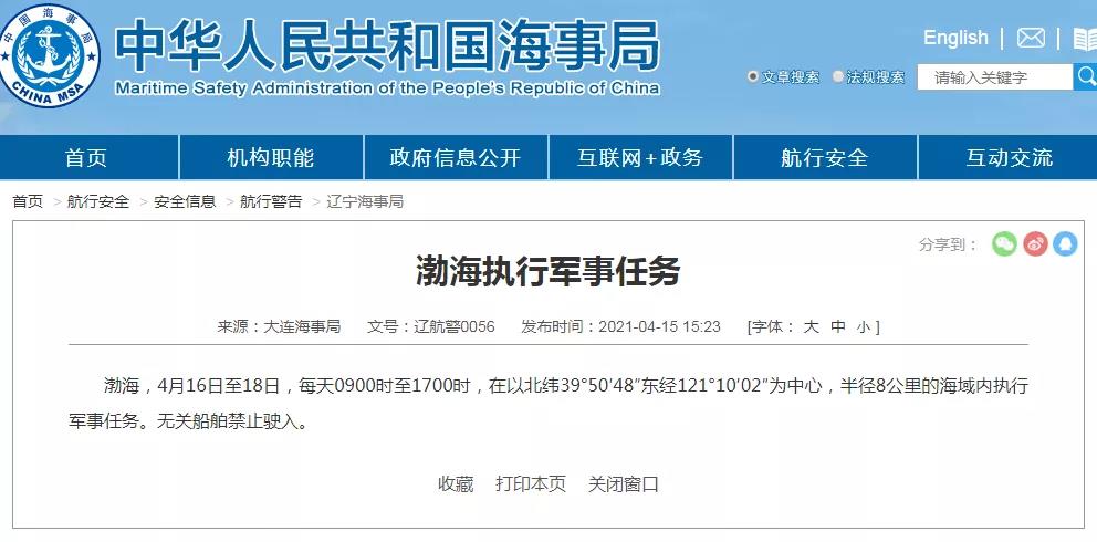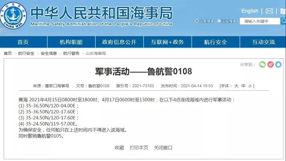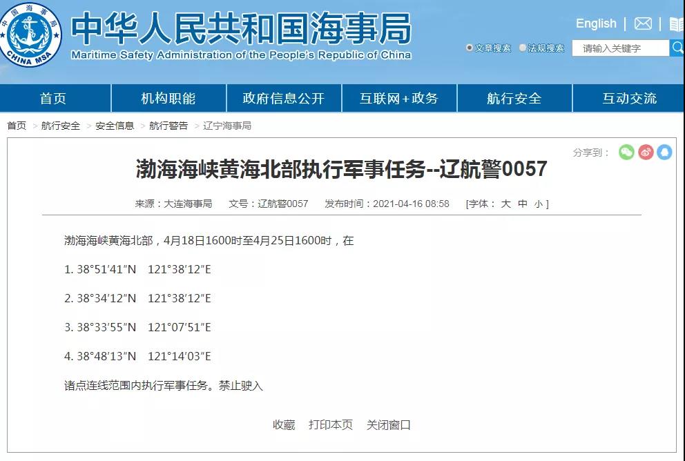 4月14日至4月25日期间,渤海、黄海、黄海,部分海域执行军事任务,禁止无关船舶驶入。