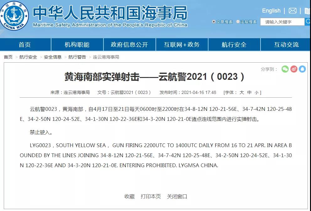 云航警0023,黄海南部,自4月17日至21日每天0600时至2200时在