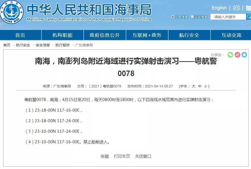 粤航警0075,南海,4月14日至17日每天0700时至1800时,以下四点连线海域进行射击演习: