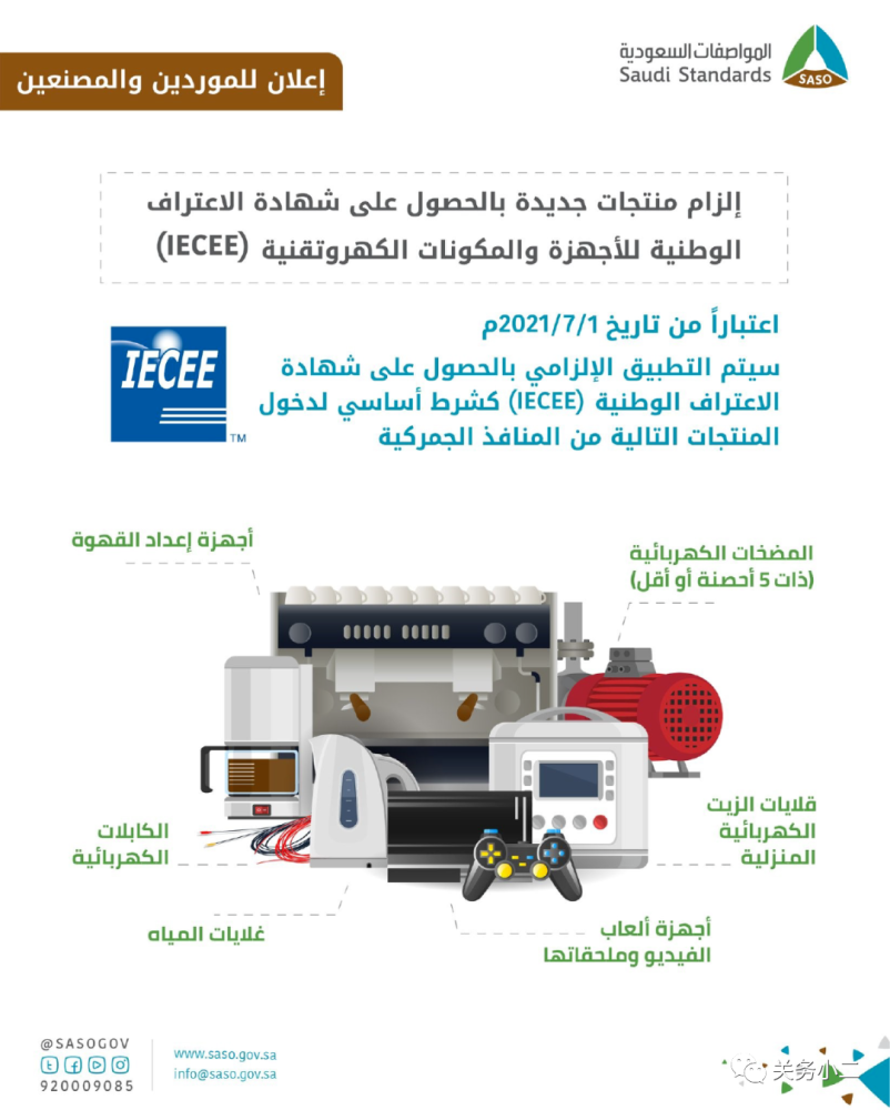 2021年3月,沙特阿拉伯标准局 (SASO) 在其官网公布消息称:自2021年7月1日起扩大IECEE认证管控范围,新增六类产品。