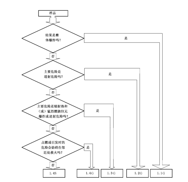 如果没有发生需要把产品划入1.1项、1.2项或1.3项的情况,但出现一个火球或火舌延伸到火焰1米以外、迸射出来的燃烧物被抛射到距离包装件边缘5米以外、任何验证屏有大于4毫米深的凹痕、抛射物抛射距离超过表1所示8J抛射物的距离,产品即被划入1.4项兼容组S以外的一个兼容组。