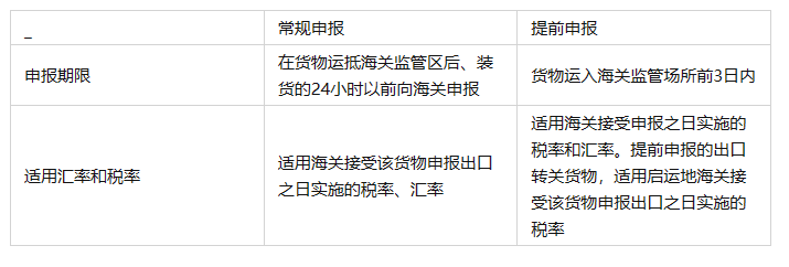 提前申报的出口货物,适用海关接受申报之日实施的汇率和税率;提前申报的出口转关货物,应当适用启运地海关接受该货物申报出口之日实施的税率。