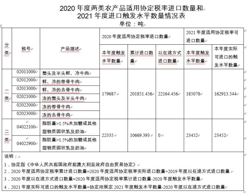 根据公告,2021年度适用协定税率实际可进口牛肉的触发水平数量为162913.544吨。