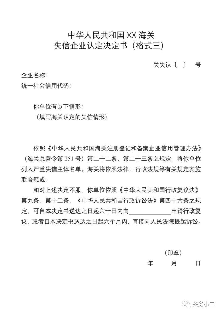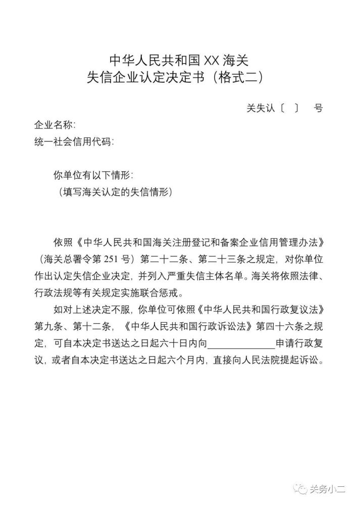 附件10:中华人民共和国XX海关失信企业认定决定书