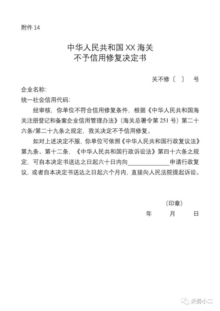 附件14:中华人民共和国XX海关不予信用修复决定书