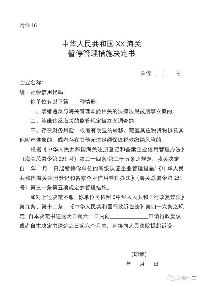 附件16:中华人民共和国XX海关暂停管理措施决定书