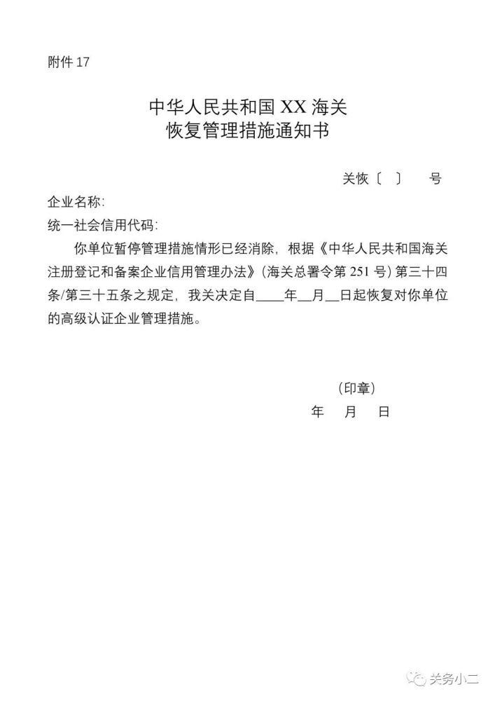 附件17:中华人民共和国XX海关恢复管理措施通知