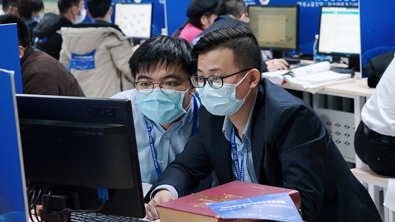 心海报关有限公司的 应俊、童澍, 在竞赛中沉着应战、全力以赴,认真梳理每一题。