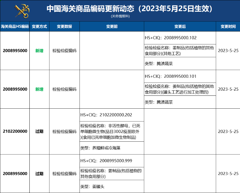 提醒: 2023年5月25日 中国海关更新2个商品编码共4项相关信息。