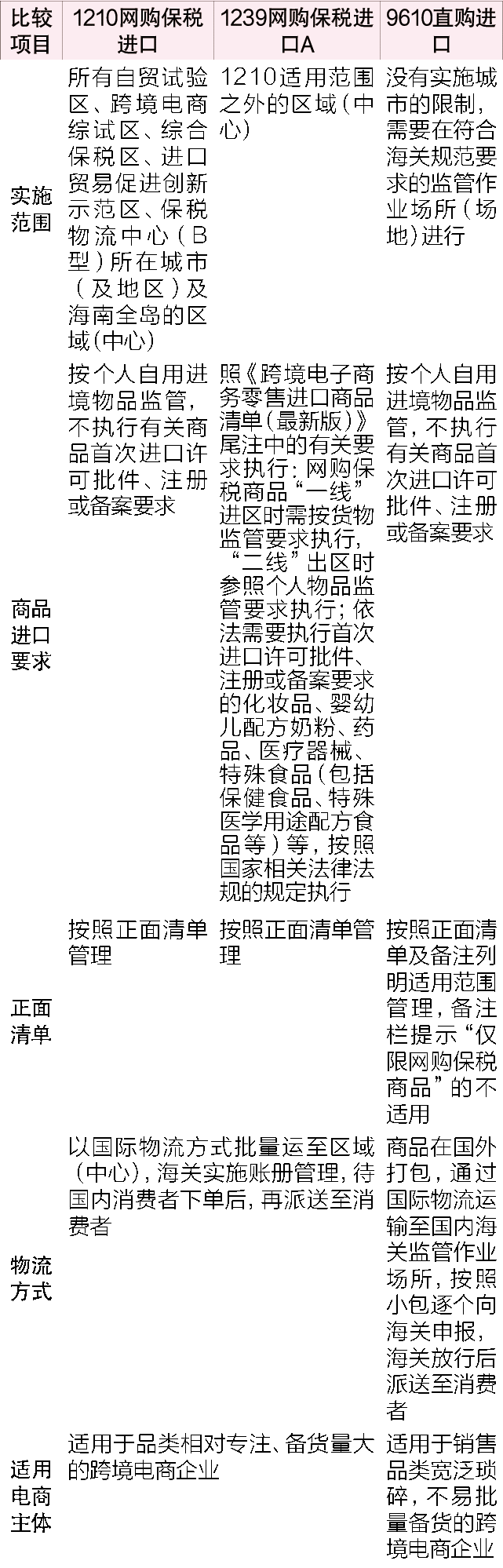 结合上期所讨论的“网购保税进口”,表1对三种模式进行比较分析。