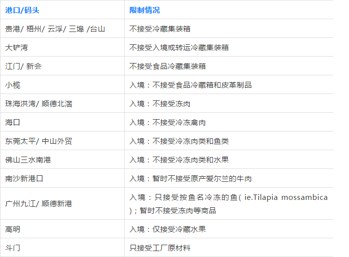 以下是船公司赫伯罗特发布的通知中,部分港口和码头不接受冷藏箱和冷冻产品海运报关: