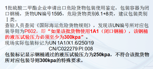 空运出口液体丙溴磷原药包装使用鉴定时发现,企业无法提供全部46个闭口钢桶的气密性试验报告,不符合标准《出口危险货物包装检验规程 第3部分:使用鉴定》(SN/T 0370.3-2012)第3.2.7条“如果属于盛装液体危险货物的包装,需要提供每个包装容器的气密试验合格报告”。经技术中心检验,其中3个钢桶存在气密性缺陷。