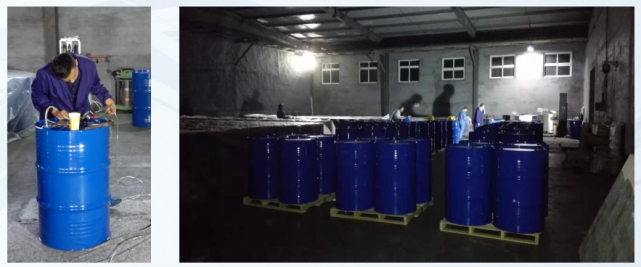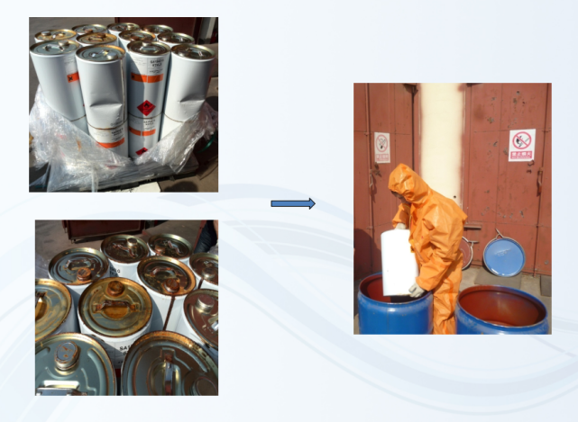 进口危险化学品——聚酯树脂清漆(聚胺酯漆)发现包装锈蚀、破裂,内装物洒漏。(更换救助包装)