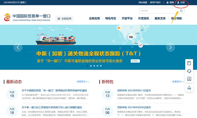 ①登录“中国国际贸易单一窗口”(网址: https://www. singlewindow.cn/ ),点击右上角“注册”,进入账号登录界面。