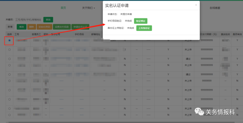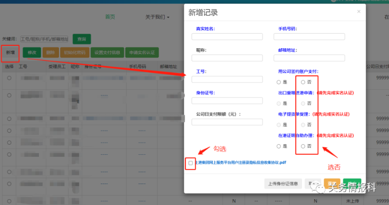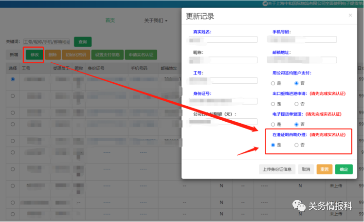 4、待后台审核人员审核通过后(一般1-2个工作日),选择该业务员,点击修改,授权允许【在港证明自助办理】。完成以上实名认证及授权后,即可在自助一体机上办理在港证明业务。