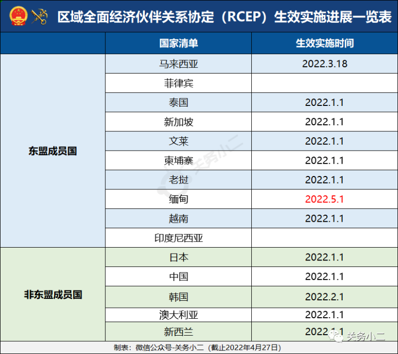 2022年5月1日起,缅甸对RCEP各成员国实施RCEP协定生效,中国也将对自缅甸进口的适用RCEP原产地标准的货物给予优惠协定税率(截止发稿,RCEP剩余菲律宾和印度尼西亚还未生效)。