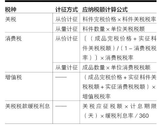 若企业选择按料件征收关税,则关税按对应进口料件缴纳并补缴关税税款缓税利息,消费税、增值税按成品缴纳。若料件涉及“两反一保”,企业应按料件缴纳相应税款或保证金,再缴纳相应的增值税、消费税或保证金。有关计算方法见下表。