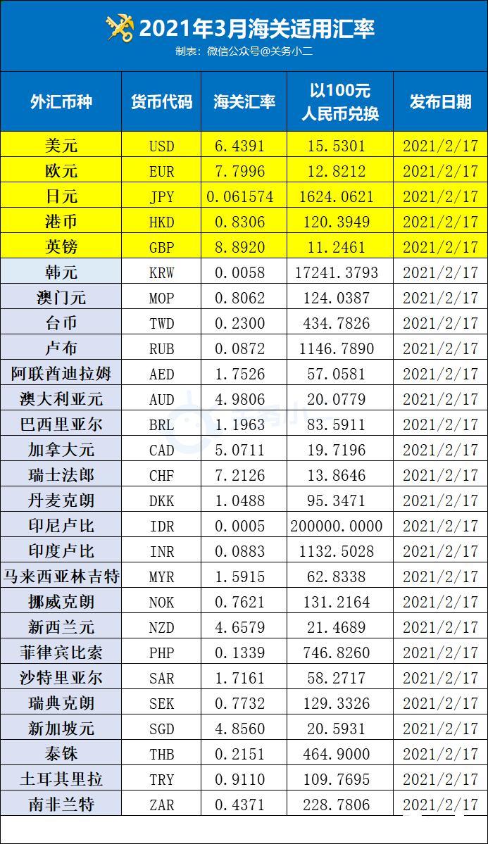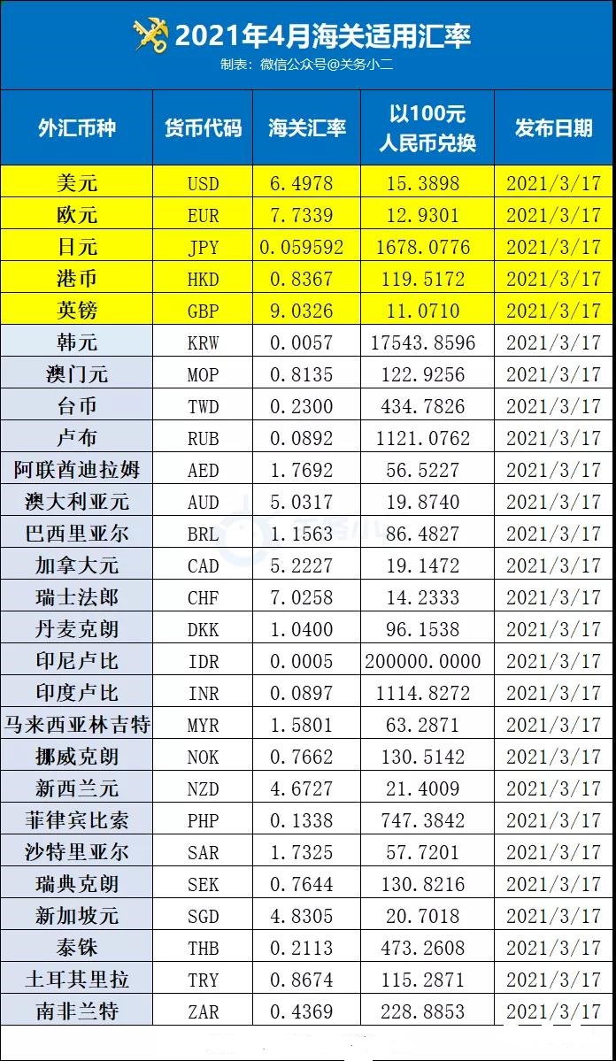 2021年3月海关汇率(对比) 2021年3月海关汇率(对比)
