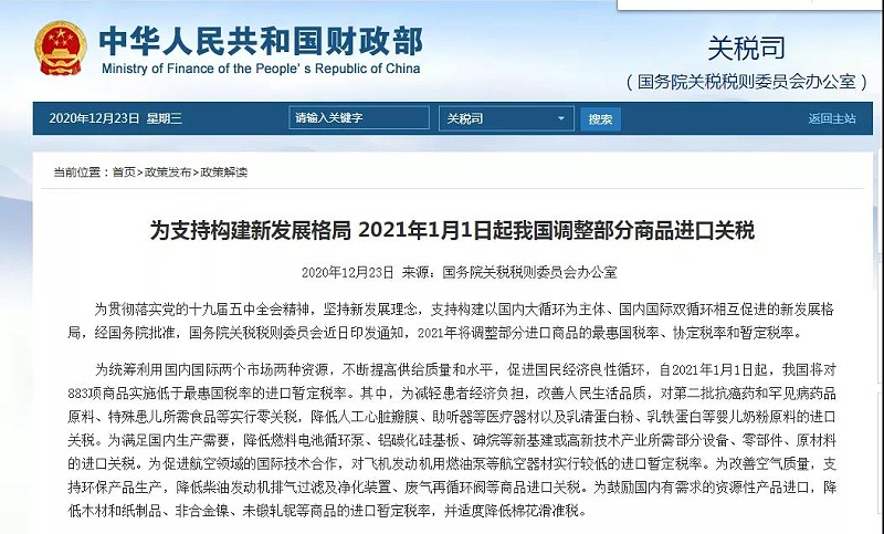 进口关税迎来新一轮调整,送出惠民生和促经济的政策“礼包”。 国务院关税税则委员会发布关于2021年进口暂定税率等调整方案的通知,从2021年1月1日起,部分商品的进口关税将有所变化。支持一些抗癌药、医疗器材、婴儿奶粉的价格下降,与新基建和高新技术产业发展相关的部分进口设备以及零部件将有更充足保障。