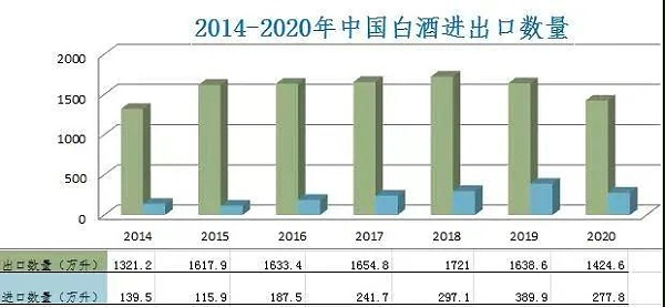 “琴棋书画诗酒花, 当年件件不离它。”中国制酒历史源远流长,品种繁多,名酒荟萃,享誉中外。2020年中国白酒出口1424.6万升,进口277.8万升。白酒,外文名:Baijiu(Chinese Baijiu),同中国功夫(Chinese Gongfu)一样,是中国产品和中华文化融入世界的又一个鲜亮符号和名片。