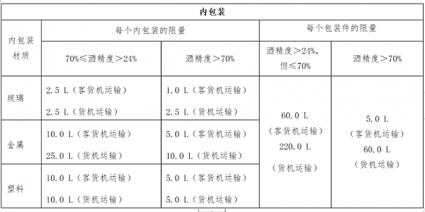 国际民航组织(ICAO)和国际航协(IATA)出版的《危险品规则》将酒精饮料根据体积分数的不同,分为24%~70%和70%以上酒精饮料两种情况。体积分数为24%~70%的酒精饮料,采用Ⅲ类包装,体积分数在70%以上的酒精饮料采用Ⅱ类包装。