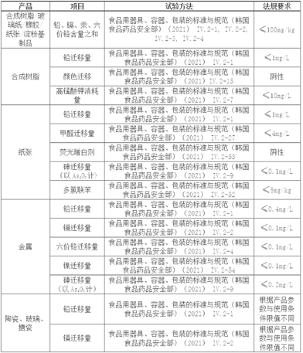 韩国以建立产品标准的方式对食品接触的终产品进行管理,不对食品接触物质用原料进行法规管理和新物质许可。用于销售或经营目的食品器具、容器和包装,需满足《食品用器具、容器、包装的标准与规范》6对陶瓷、玻璃、搪瓷、纸张和金属等不同食品接触材料的具体要求,部分常见材质要求见下表。