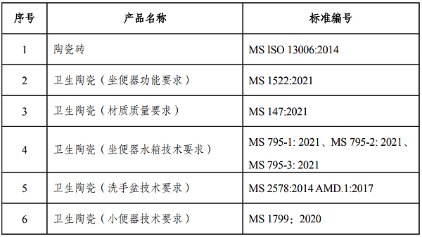 根据马来西亚贸工部520 号法案5(2011 年修正案)要求,进口建筑卫生陶瓷产品必须经过合规程序马来西亚标准(MS)的要求,再由马来西亚标准局指定认证机构出具合格评定证书后,才能在马来西亚海关清关。